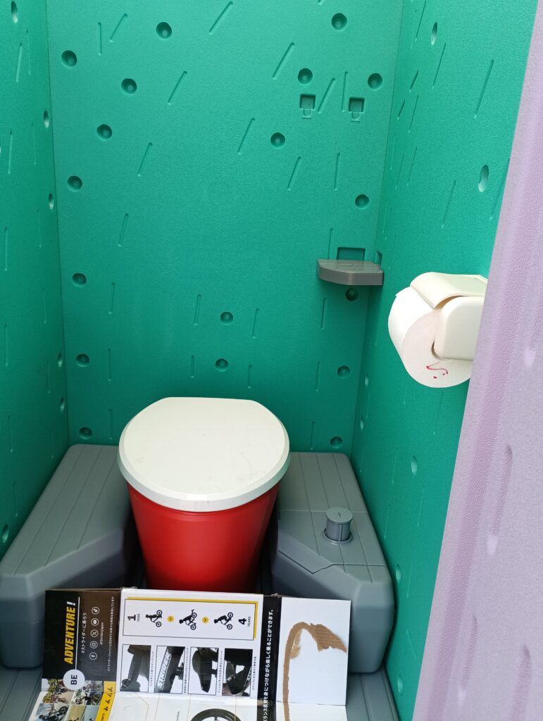 洋式仮設トイレの設置が完了しました。使用後は次に使用する方の事を考えて使用してください。