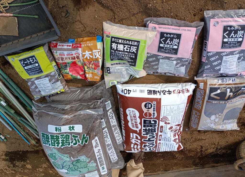 牛糞、もみ殻入り牛糞、もみ殻燻炭、有機石灰、骨粉入り油粕、ピートモス。もみ殻でもいいがつ発酵に時間がかかるのでもみ殻燻炭は即効性がある、もみ殻は浄化作用がある。鶏糞は追肥として使用。作付け前に写真の肥料を漉き込むだけ。