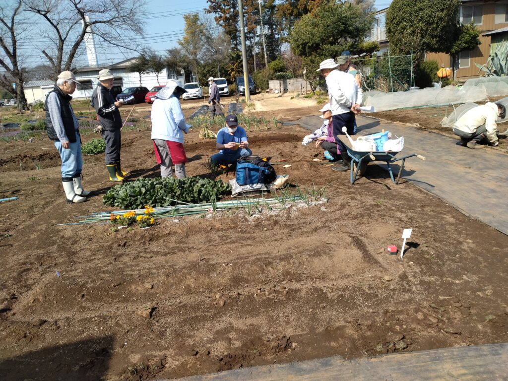 3日前の天候から一変、今日は春野菜の種の植え付け。新会員は指導者の作付け説明に真剣。継続会員は自己区画で作付け。