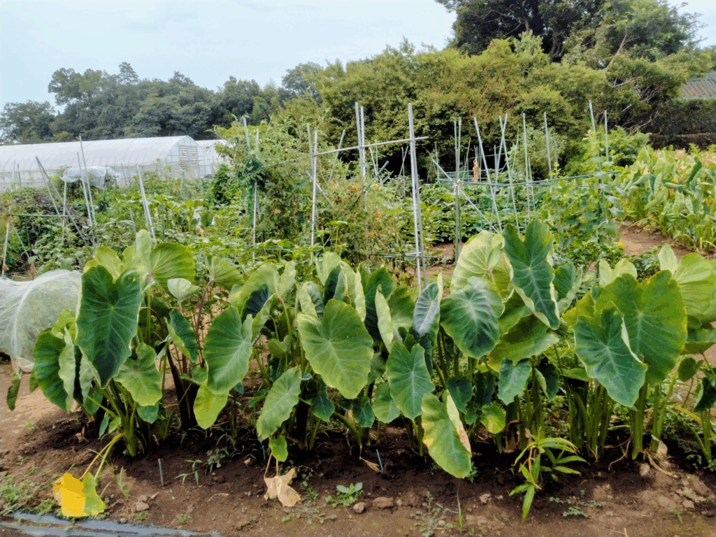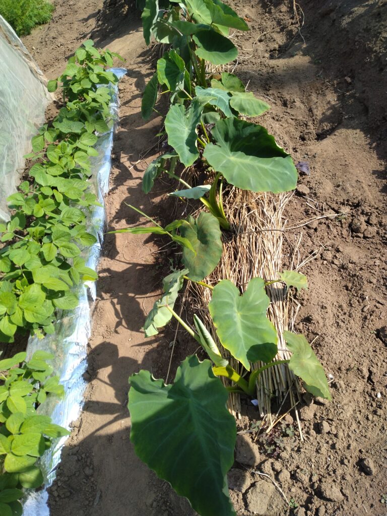 休憩を取りながら16畝のネット掛けと次年度種用の里芋の水やり。