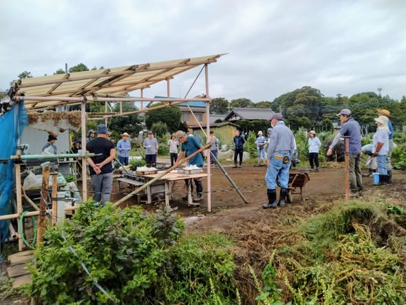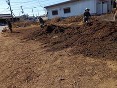池田さん宅の老朽化した境界ブロックの入れ替えでユンボが入っていた区画の草取り、秋野菜作りの準備。ところが、土の中にがれきが混じっていたり、土が石の様に固くなっているところが、耕運機は使えずスコップで1堀2堀と2時間がかり。業者は農地の土と建設現場の土(がれきが混ざっていたり土壌が硬くなった状態)では野菜づくりはできない事知らないんだな・・・・文句言うわけにもいかず・・・。古間木の芝づくりで積み上げられた土も、.トラックで搬入しユンボで平らにしているだろうから同じなんだろうな・・・野菜や芝が作れる状態ではないよね。 土といえど、植物を育てる土質と公園などの積み固めればよい土質は違う。知ってほしいけど建設業者に求めるのは無理かな。