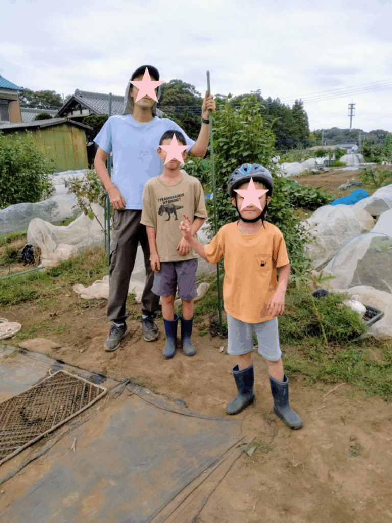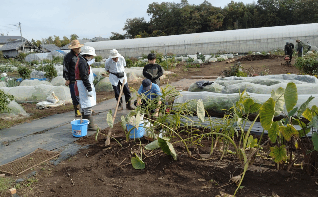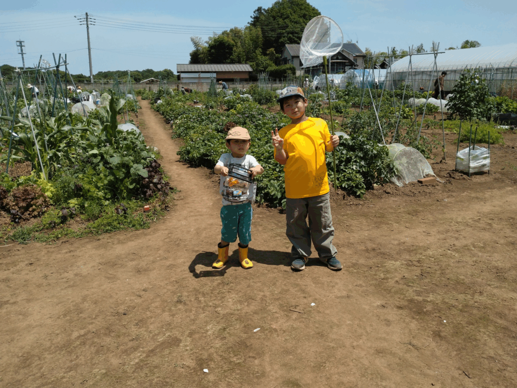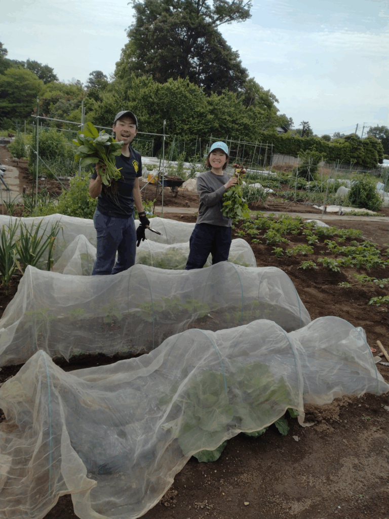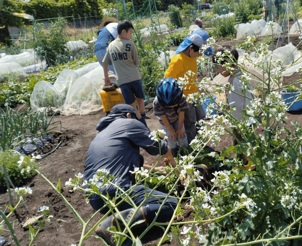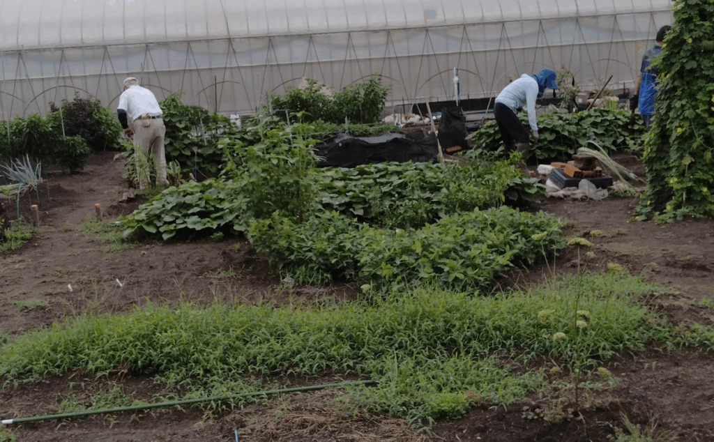退職後の生きがい、健康管理の有機野菜は自らの手でとご夫婦で、虫や自然に興味のあるお子さんと一緒にそれぞれの思いで作業。平日来れない常勤者も頑張ってます。​