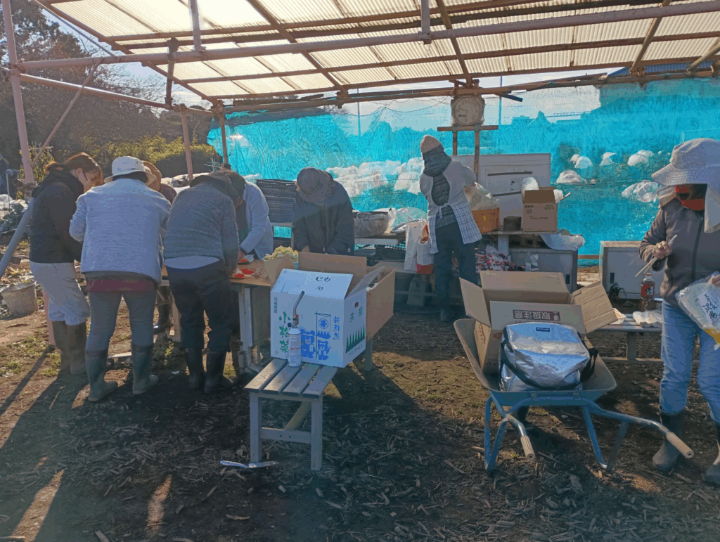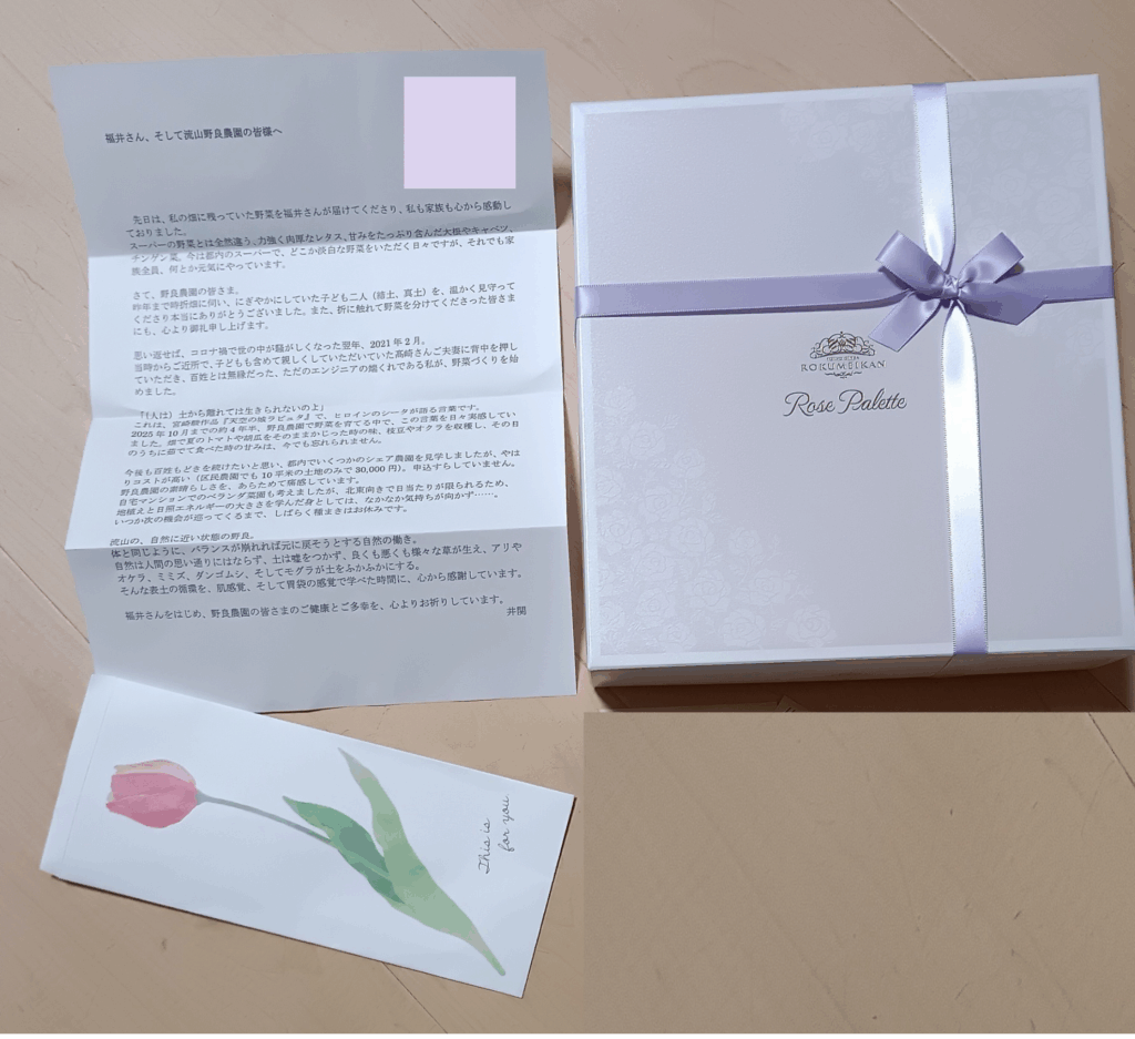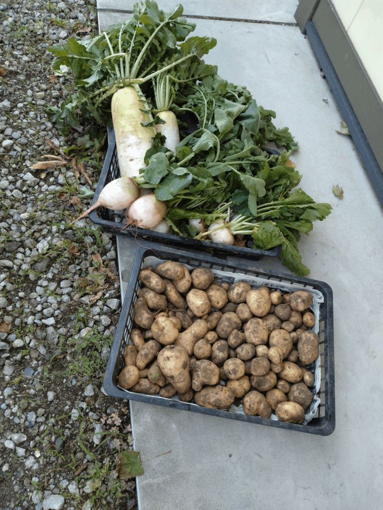 通勤の都合で引っ越しされた会員井関さんの利用区画には収穫物が残っていたので2回宅配そして年明けに里芋大根を。年始めの昨夜てよかった。次代を背負うお子様の思い出の1ページ。人生の先輩としての仕事役目は果たせたのかなと、会員皆様に報告です。菓子折りは交流会時に参加者で頂きます。