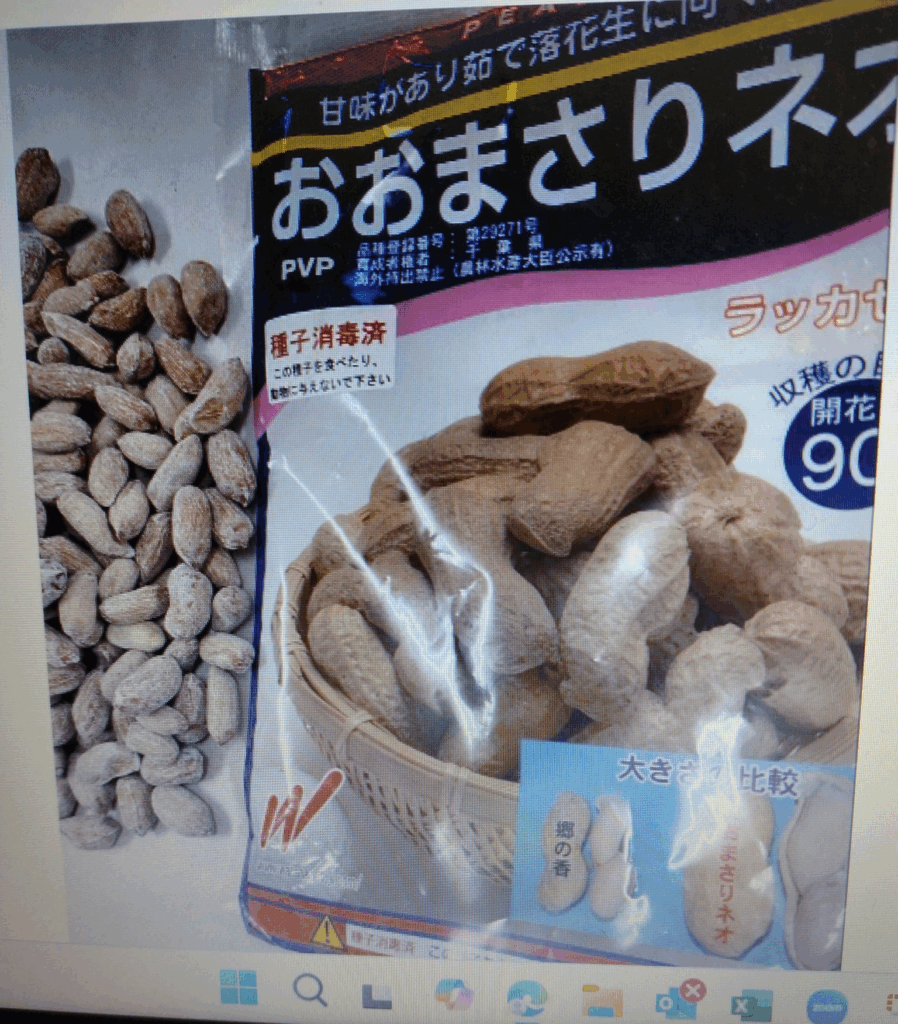(土 播種―オクラ(丸、角)、落花生、つるありインゲン  定植―ズッキー二(1)、                              毎年作付けしている極大粒で甘いおおまさりネオ。