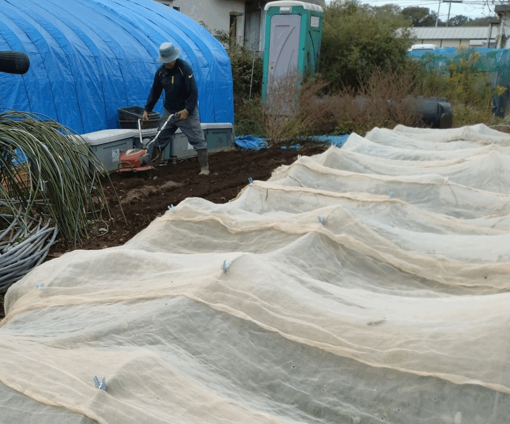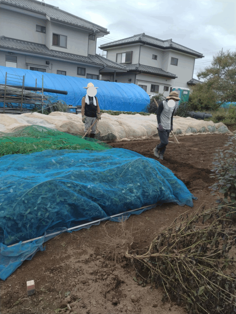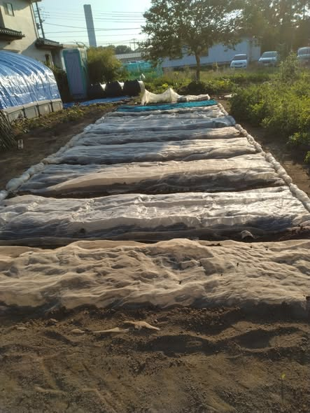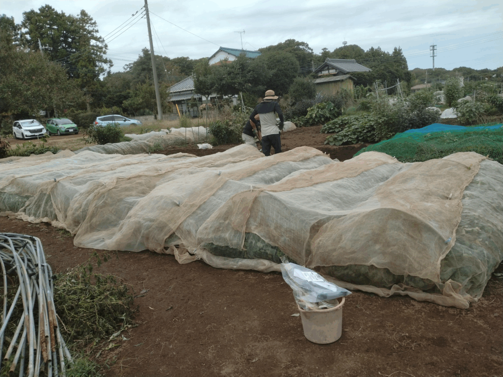 朝8時~11月作付け予定の赤玉ねぎの種まき。畝を作りばらまきしネットをかける。落花生もカラスに食べられないようにネット掛け。