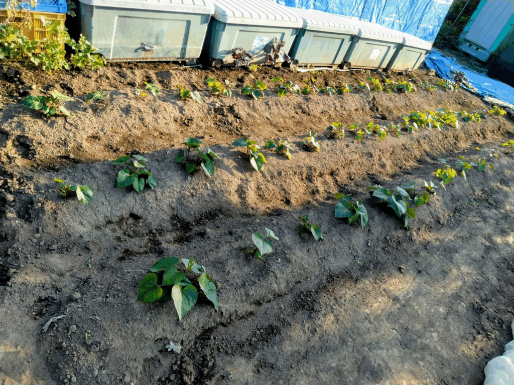 2週間前に植え付けたサツマイモも根付いて元気。元気が一番!!!