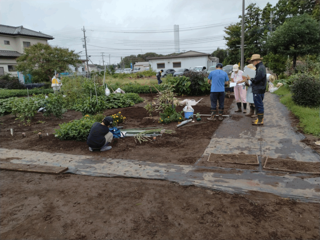 涼しくなる時を待って秋野菜の作付け開始、雨上がりの9月13日、今日は気温20度台。キャベツ、ブロッコリー、ステックセニョールの苗と小松菜、大根、チンゲンサイ、ラデッシュの種の作付けです。新会員さんは経験者から作付け指導後に実践。