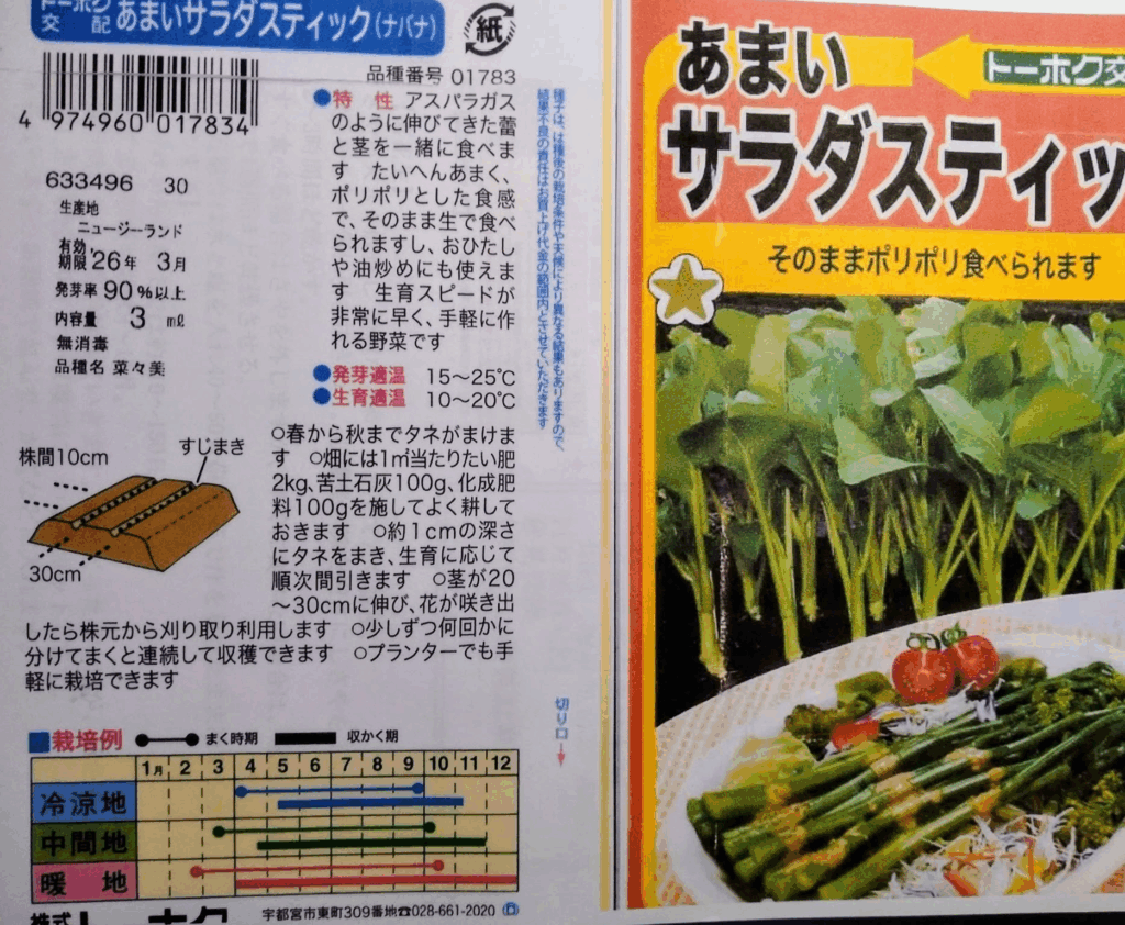 高温が続く近年、種まき時期は袋の裏の作付け育成温度を参考にして種まき。