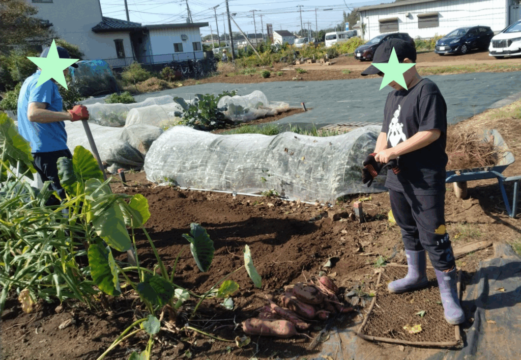 活動日に参加できなかった共働きの新会員さんは休日の午前中に畑仕事、大きなサツマイモが収穫できて大喜び。