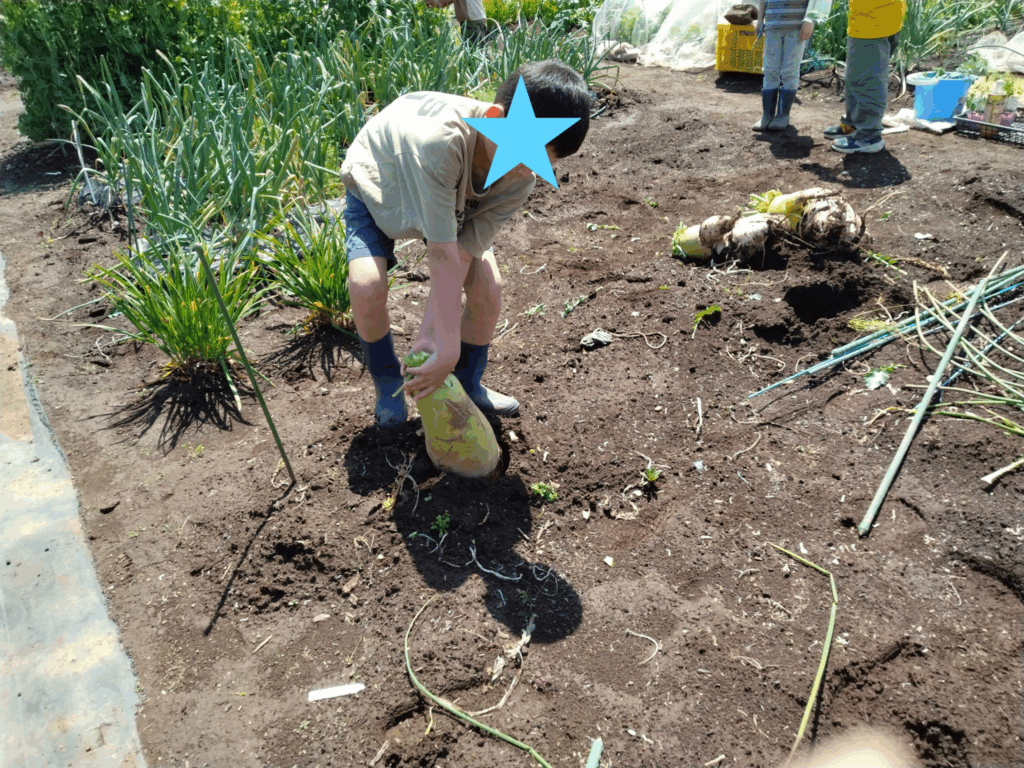 気温上昇と降水により野菜の育ちもよい反面草も元気です。伸びてからでは重労働こまめに草刈りします。新会員には経験と知識豊かな指導者が対応してくれてます。指導者の野菜の育ちは有機、化学肥料は使わないのにとても立派。子供たちは野菜や土の中にいる虫取りに夢中。