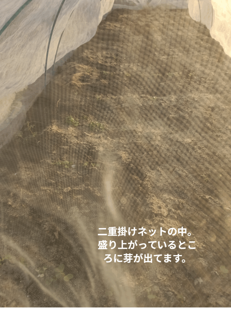 でも気温が高いからと遅めの11月に種撒き、土の上に米ぬかをまき、ネットは2重に。先週は土が盛り上がり、昨日は芽が出ていました。